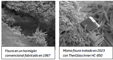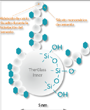 El catalizador que contiene es capaz de reactivar las partículas anhidras de cemento que no han reaccionado durante el proceso de hidratación y la presencia en el hormigón, de calcio libre combinable proveniente entre otros, del hidróxido de calcio generado durante la hidratación del cemento, interactúa con los productos para la nanocristalización catalizada de TherGlass®, generando nuevas formaciones de silicatos de calcio insolubles que llenan microfisuras, poros y capilares dentro de la microestructura del cemento.