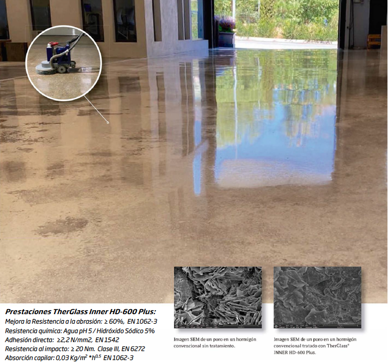 TherGlass® INNER HD-600 Plus, es menos alcalino que los selladores de sodio o potasio. Su menor viscosidad y menor tamaño de iones, hacen que la penetración en el soporte sea más profunda y más compleja, ralentizando la reacción química con los componentes de calcio libres que recubren los canales capilares microscópicos en el hormigón, para formar un hidruro de silicato de calcio insoluble, que además de limitar la penetración de la humedad, aporta extremadas resistencias físico-químicas, reforzando terrazos, mármoles, y lechadas autonivelantes de cemento y hormigones, llegando a aumentar en estos casos, la resistencia al impacto y a la abrasión en más de un 60%