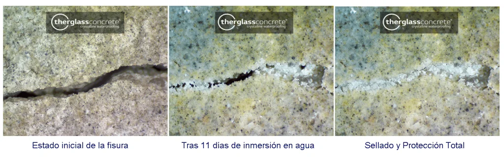 Cuando se formen grietas o fisuras por retracción durante el fraguado, asentamiento, movimientos, etc., el agua pasará a través de éstas, reactivando de nuevo el proceso de cristalización y dará lugar al crecimiento de una nueva formación de cristales, que obturarán y sellarán las grietas y fisuras.